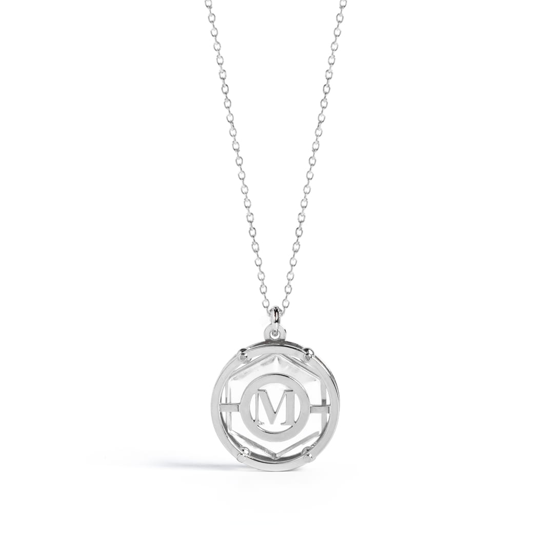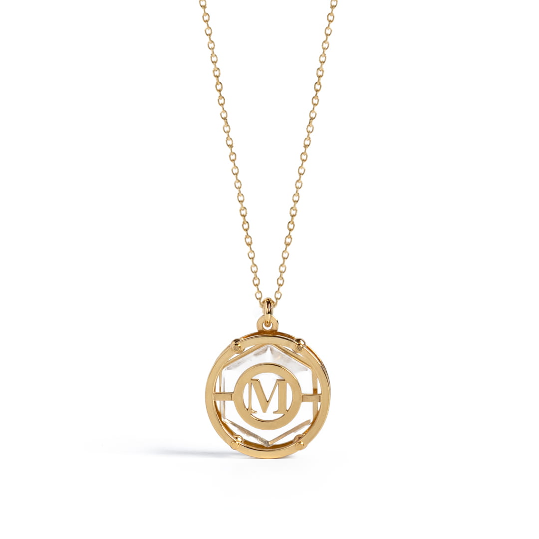 Zawieszka jest zdobiona naturalnym ręcznie szlifowanym kryształem górskim. Kryształ górski został umieszczony w taki sposób, aby tworzył delikatne kryształowe tło dla literki, a z drugiej strony, aby zapewniał kontakt z ciałem.