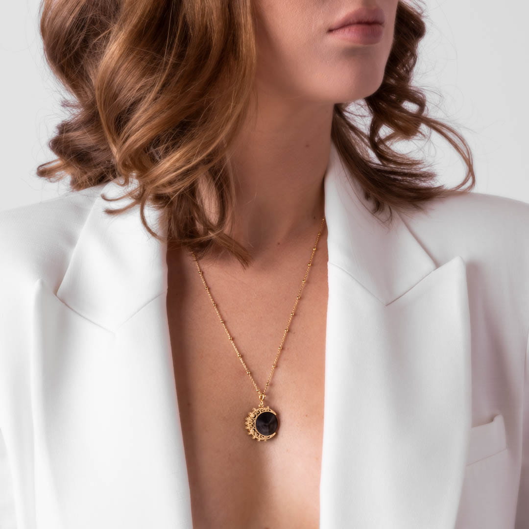 Złoty Naszyjnik Lunula Obsydian MOON